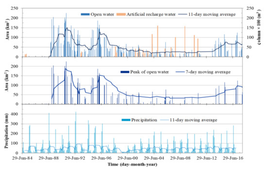 Time variation of open water extents within the wetland range in 2017 for 190 scenes and precipitation from 1984 to 2017. The upper graph is a multi-temporal variation of open water extent (km2) overlaid over the artificial water recharge volume (100 m3 unit), the middle is the peak of open water extent (km2) each year in November and December, and the bottom is the monthly precipitation in the same year.