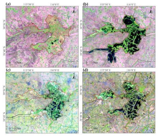 The satellite long-term observations can help us better to know the changes in wetlands and review the past wetland habitats and landscapes that may be undamaged by human disturbances [2,3]. Landsat observations, from Multispectral Scanner (MSS), Thematic Mapper (TM), Enhanced Thematic Mapper Plus (ETM+) and Operational Land Imager (OLI) sensors, have accumulated long time data of 45 years. These data have been applied in an extensive investigation of wetland as there are reliable and mature data processing methods available such as extracting water, classification, change detection, etc., [4,5,6,7,8]. Some research assessed the water extent, loss, gain, and type conversions of wetland using Landsat observing data during the years of 1979–2015 [9,10,11]. The mapping of wetland yearly and type conversions of wetland were mostly implemented using the yearly season observing data of Landsat during 1978–2008 [8,10,12,13,14,15,16]. Zhu et al. classified the land cover of wetland, including water, floating vegetation, emergent vegetation, paddy field, cropping fields and built-up, in Baiyangdian wetland every five years using Landsat data from 1975 to 2018 and explored their type conversion by the classifying results [16]. The research above mostly focused on demonstrating the mapping, classification, changes of loss and types conversion of wetland, lacking investigations of subtle changes of wetland habitats and reviewing the inherent habitats of wetland. The diverse habitats of wetland are varied seasonally and yearly under the influence of climate and human activity, and are the interaction e.g., the water extent and aquatic vegetation would maintain an equilibrium ratio within the wetland as the water could affect and be affected with the growth of aquatic vegetation in lake wetland like Baiyangdian wetland.