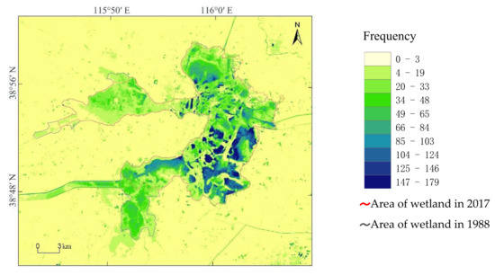 The wetland habitat of Baiyangdian, as a lake-type wetland, is primarily composed of the water body and aquatic vegetation, where the water body is the nutrient source of aquatic plants [20]. We calculated the time cumulative frequency of open water for each pixel in 190 scenes of Landsat time-series data from 1984 to 2017 (Figure 6). Figure 6 presented the spatial pattern of the hydrological conditions of wetland habitats. The less the frequency is, the drier the wetland tends to be in Figure 6. The maximum frequency of open water is 179 rather than 190 using all Landsat temporal scenes as there is open water extracted within the wetland in 11-temporal scenes due to the wetland drying up in during 1984 to 1988 (Figure 5a).