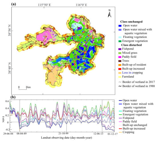 (a) The classes of wetland habitats obtained by clustering NDVI time variations from 1984 to 2017 and (b) time smoothed variations of averaged NDVI for typical classes across the wetland range of 2017.