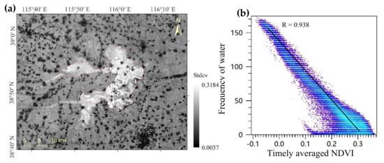 The standard deviation of time-series NDVI is significantly much greater than that of land (Figure 9a), which indicates the sharply seasonal alternation of aquatic vegetation and water in the wetland. The histogram of time averaged NDVI and water frequency, as shown in Figure 9b, demonstrates that alternation of aquatic vegetation and water mostly occurs over emergent vegetation with 0.3 ± 0.3 of NDVI and 6%–20% of total water frequency.