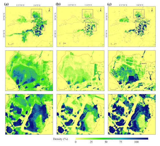 To probe the changes of wetland in the three phases obtained above, we calculated the density of open water each pixel in the three phases respectively, by cumulating the number of extracted open water divided by the whole number of used temporal during a period that is 75 temporal in the first phase of 1988–1998, 72 temporal in the second phase of 1999–2011, and 24 temporal in the third phase of 2013–2017. Figure 10 presents the water density images in the three phases across the study area and two local areas, which are mostly leisure parks and fishponds. Table 2 shows the statistical results of open water extent, density, and NDVI across the whole wetland of 2017 for the three phases.