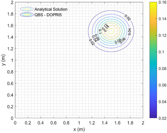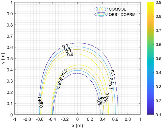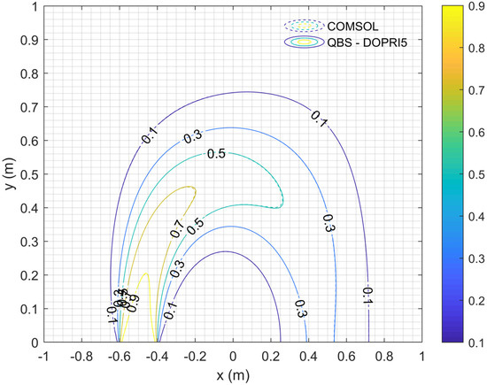 When the same problem is solved considering scenario B, the results are presented in Table 8. As can be seen from Table 8, QBS-DOPRI5 with and FDM-DOPRI5 with reach the same accuracy as the reference solution. Comparing the CPU times spent under these conditions, QBS-DOPRI5 was found to be 1061.82 times faster than FDM-DOPRI5. Moreover, this example is solved with COMSOL Multiphysics, the well-known FEM commercial code, under scenario B. This solution was obtained by activating the adaptive mesh refinement property in the COMSOL Multiphysics program and using 30763 triangular elements. It should be noted that QBS-DOPRI5 and COMSOL Multiphysics results are exactly the same. These results are illustrated in Figure 7. Also, COMSOL Multiphysics output results used to plot Figure 7 are presented in Table S1 file in Supplementary Materials.