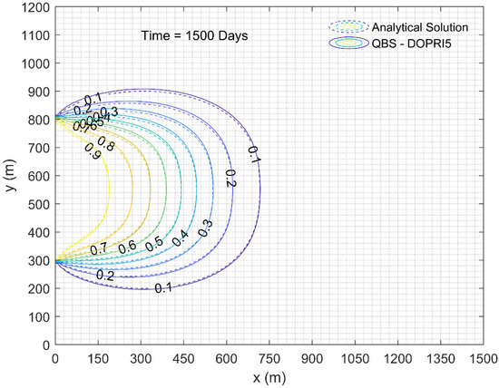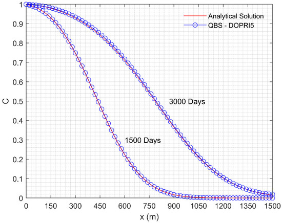 Table 7 was created to show that the proposed method achieved the same accuracy in a shorter time than standard numerical methods. As can be seen from Table 7, solutions for QBS-DOPRI5 and FDM-DOPRI5 for different h values were obtained, and their concentration values at different locations were given. CPU times spent for these solutions are also presented in the same table. When Table 7 is examined carefully, the solutions obtained for QBS-DOPRI5 with and FDM-DOPRI5 with appear to be the same as the reference solution. Comparing the CPU times (19.57 s and 1302.46 s) obtained in this case, it is obvious that the QBS-DOPRI5 method is 66.55 times faster than the FDM-DOPRI5 method.