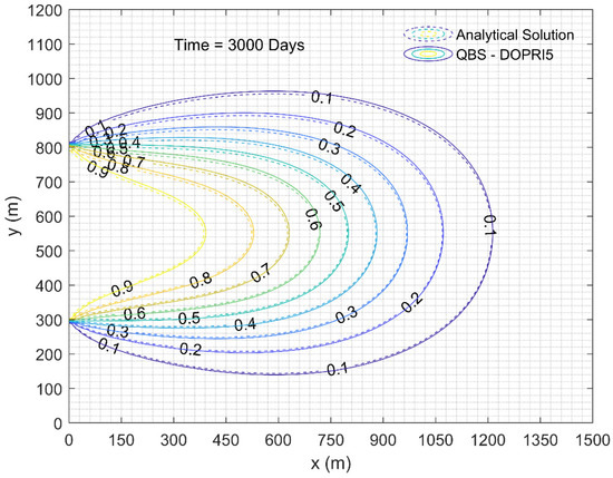 where, is the aquifer width, , , is the aquifer length, , flow velocities are , and dispersion coefficients are , . According to the assumptions of Wexler [38], and dispersion coefficients are taken as zero. Under these conditions, analytical solution of the problem given by Wexler [38]