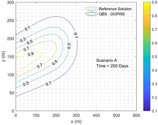 Since this example also does not have an analytical solution, a reference solution is needed to compare QBS-DOPRI5 results. For this purpose, a reference solution is obtained by activating the adaptive mesh refinement property within the COMSOL Multiphysics software. In this example, two different scenarios are created by changing the ratio of the longitudinal dispersivity to transverse dispersivity coefficients. In the first scenario (scenario A), a typical ratio of 10 is considered by taking m and m. In the second scenario (scenario B), this ratio is taken as 1000 in order to test the real potential of the proposed method. In this scenario, dispersivities are selected as and m. COMSOL Multiphysics models contain 25,806 and 106,268 triangular elements in the solution domain for Scenarios A and B, respectively.