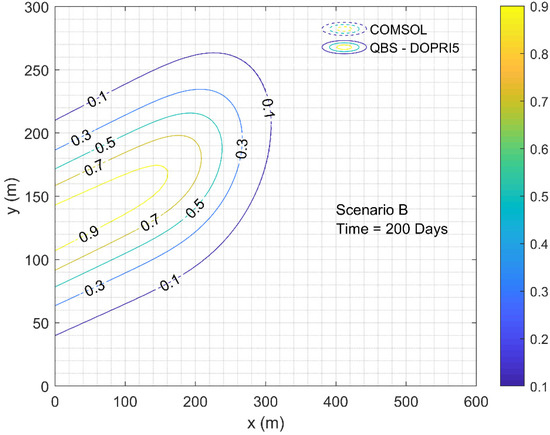 Concentration field obtained by QBS-DOPRI5 and COMSOL Multiphysics at time days for Scenario B.