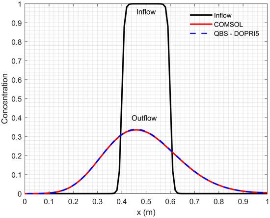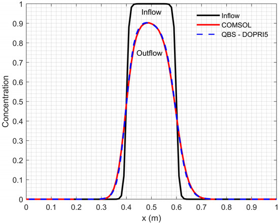 Moreover, the concentration profiles at the inlet and outlet boundaries, which are taken from the obtained solutions, are illustrated in Figure 10 and Figure 11, respectively. The effects of scenarios A and B conditions on contaminant transport are clearly seen in Figure 10 and Figure 11. It is clear that the QBS-DOPRI5 and COMSOL Multiphysics solutions are in good agreement for both scenarios. Also, COMSOL Multiphysics output results used to plot Figure 8 and Figure 9 are presented in Tables S2 and S3 file in Supplementary Materials, respectively. Moreover, the numerical values of the concentration profiles at the open boundary are presented separately in Table 9 for both scenarios.
