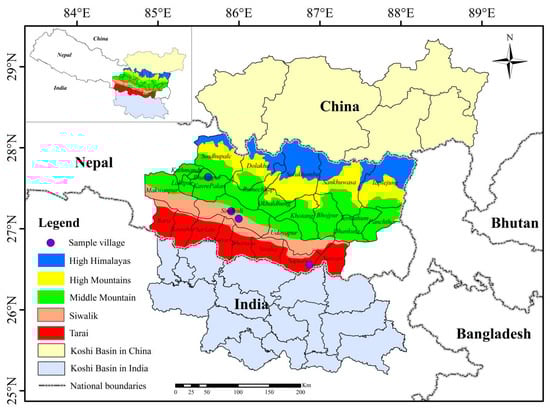 The Koshi River which runs from north to south for a total length of 255 km originates in the middle part of the Himalayan orogen. The basin spans some parts of Tibet in the southwest of China, eastern Nepal, and northern India and it covers an area of 59,000 km2. This paper focuses on the part of the basin in Nepal, with an area of about 39,500 km2 and a population density of 329 per square kilometer []. The study area can be divided into five regions including High Himalayas, High Mountains, Middle Mountain, Siwalik, and Tarai []. The elevation ranges from 57 masl in the Tarai to 8431 masl in the High Himalayas. More than 70% of the study area is mountainous, which increases the household vulnerability to natural disasters, especially droughts and floods (Figure 1).