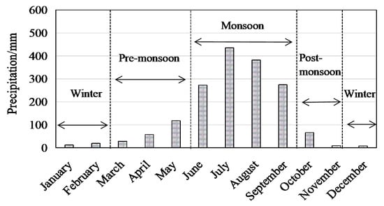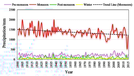 In the study area, the annual average temperature is 10.5 ℃ and the average rainfall is 1683 mm []. There are the following four distinct climatic seasons in the Koshi River Basin: pre-monsoon (March–May), monsoon (June–September), post-monsoon (October–November), and winter (December–February) []; about 80% of the precipitation occurred in the monsoon season (Figure 2). Figure 3 shows the trend line of precipitation during the monsoon season for 1901–2015, indicating a clear picture of decreasing precipitation. Seasonal drought is the main threat to rural livelihood. Almost every year, people experienced localized droughts which caused crop losses and jeopardized sustainable development of the study area []. The spring drought from 1985 to 2014 was reported to be frequent in Nepal. It occurred at least 4 or 5 times in most regions of the Koshi River Basin []. Frequent droughts have threatened food production, water security, and livestock losses. As a result, the household income decreased and some people suffered from hunger, thirst, and poverty.