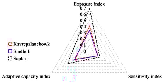 The subcomponents, major components, and the composite DVI for each district are presented in Table 3. Among three districts, the highest value of exposure was recorded in the Saptari district (0.700) and lowest value in the Sindhuli district (0.341). In a drought-prone region, the drought intensity, duration, and frequency can potentially create high exposure to climate change among farmers [,,,]. Saptari showed a higher drought intensity, longer drought duration, and lower drought frequency than Kavrepalanchowk and Sindhuli (the drought intensity was 0.80 in Saptari, indicating that the region was threatened by water scarcity which was a serious constraint for crop production []. Furthermore, the long drought duration could increase the risk of crop failure in Saptari).
