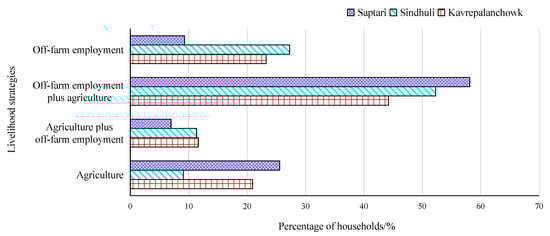 Many farmers in the Koshi River Basin choose the livelihood diversification strategy in the context of climate change. It takes a great deal of time to get a water source for many households in Kavrepalanchowk and most families do not have irrigation facilities, which greatly increases the water pressure on local people. Therefore, most households choose to seek off-farm employment to decrease their drought vulnerability and diversify their sources of income. Sindhuli is not a drought-prone area and families have low drought vulnerability. However, it is not enough to maintain their livelihoods if agriculture is the only source of income due to the scarcity of land in Sindhuli. Many men have to be seasonal out-working labors or do a small business to diversify their sources of income. Most households have high drought vulnerability in Saptari, therefore, they take advantage of the high population density and the convenient transport to engage in off-farm activities. Some households with access to irrigation are less vulnerable to drought disasters than others, and they depend on agriculture for their livelihoods (Figure 5).