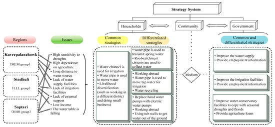 As shown in Figure 6, the three districts belong to the MLM group (Kavrepalanchowk), LLL group (Sindhuli), and HHH group (Saptari). There are three main problems in Kavrepalanchowk as follows: (A) Many households depend significantly on agriculture as their main source of income, which increases their vulnerability to climate change; (B) households without water supply facilities need to travel long distances from their house to collect water; and (C) households lack of irrigation facilities. People in Kavrepalanchowk often take livelihood strategies including working in a different district and doing small business to diversify their sources of income. In addition, they employ different types of strategies that help in reducing water pressure. Specifically, water pipes are used to transmit spring water to houses and water channels are used to guide water from rivers to the farmland. In addition, roof-catchment cisterns are important systems which are used to collect rainwater for households. Moreover, the Community Employment Alliance has been built to provide employment information for residents who need non-agricultural jobs and the government needs to improve the water supply. There are four main problems in Sindhuli as follows: (A) Many households depend highly on agriculture as their main source of income; (B) the income is at a low level; (C) households lack of irrigation facilities; and (D) the percentage of households with external support is low. People in Sindhuli often take livelihood strategies including working in a different district, working abroad, and doing small business to increase their income. The water pipe is used to move tap water to the farmland for irrigation, which greatly reduces household vulnerability to drought disasters. Water recycling is also an important drought adaptation strategy, which means reusing wastewater for beneficial purposes such as agricultural irrigation and toilet flushing is an efficient way to save water. In addition, employment information provided by the Community Employment Alliance plays a key role in diversifying residents’ sources of income. People in Saptari have high adaptive capacity, but there are still some challenges such as the high sensitivity to drought disasters and the low percentage of households with external support. The majority of water used for self-supplied domestic and livestock purposes comes from groundwater sources in Saptari and many people use electric water pumps and tub wells to get water out of the ground. The water channel is used to guide water from rivers to the farmland. In addition, agriculture loans provided by the government are vital for residents suffered from drought disasters. To facilitate the allocation of water, the government should improve water conservancy facilities.