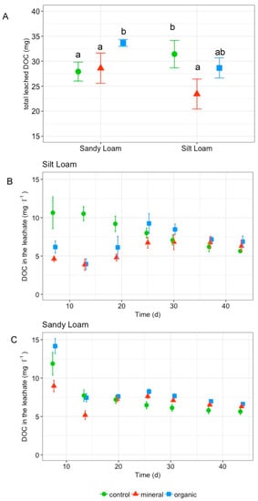 Mean (±standard deviation; SD) dissolved organic carbon (DOC) in the soil leachate: (A): Mean (±SD) total DOC amount: a summation of all time series within each treatment (left: sandy loam; right: silt loam); statistical significance of difference between treatments within the soil textures are indicated with letters (Tukey; p ≤ 0.05; Silt loam: n = 21, sandy loam: n = 28). (B,C): Temporal response curve of the mean (±SD) DOC concentration in the soil leachate percolating through silt loam ((B), n = 3) and sandy loam ((C), n = 4); Shapes indicating different fertilizer application: control (circle); mineral (triangle) and organic (square).