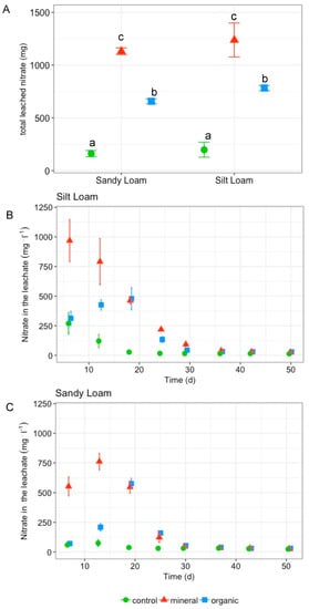 Mean (±SD) nitrate (NO3−) of the soil leachate: (A): Mean (±SD) totally NO3− amount: a summation of all time series within each treatment (left: sandy loam; right: silt loam); statistical significance of difference between treatments are indicated with letters (Tukey; p ≤ 0.05; silt loam: n = 21, sandy loam: n = 28). (B,C): temporal response curve of the mean (±SD) NO3− concentration in the soil leachate percolating through silt loam ((B), n = 3) and sandy loam ((C), n = 4). Shapes indicating different fertilizer application: control (circle); mineral (triangle) and organic (square).