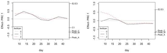 For analyzing the DOM composition, a total of 161 soil leachate samples were used allocated to seven observations per experiment with four replicates per fertilization treatment and experimental soil. One soil core had to be excluded from the analysis due to outlier correction. Since prerequisites for parametric statistical evaluation could not be met, a non-parametric test was conducted. The main and interaction effects of soil texture and fertilizer type on the DOM spectra were evaluated using a permutational MANOVA (PERMANOVA; vegan package, Euclidean distance, 999 iterations; [61]). Results of the PERMANOVA were visualized in principal response curves (PRC; vegan package) for each soil texture individually in order to illustrate the impact of fertilizer type and their interaction with time on the DOM composition. PRC is a multivariate response technique based on repeated measures over time, the resulting graph allows one to centralize the analysis on time-dependent treatment effects. As suggested by [62], DOM indices with a species weight between −0.5 and +0.5 were not shown, because they were likely to show either a weak response or a response that is unrelated to fertilization and their interaction with time. The ANOVA-like permutation test (using the constrained correspondence analysis “cca()”- function, vegan package) assessed the significance of the PRC model. Dunnet’s test was applied to assess significant shifts in DOM composition over time, using the first sampling day as a reference (vegan package).