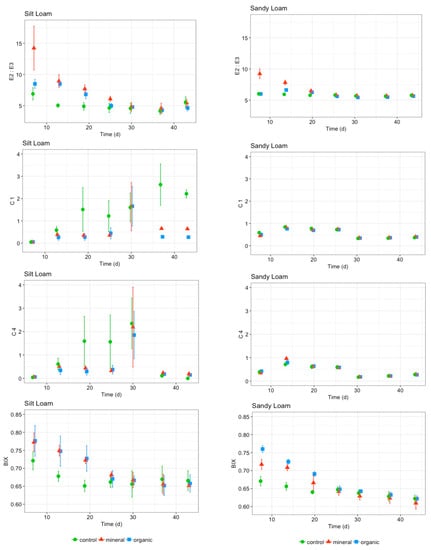 Effects of fertilizer type on dissolved organic matter (DOM) composition percolating through silt loam (left) and sandy loam (right). Mean (±SD) values of indices describing the size of the molecule (E2:E3; first line), humic-like component (C1; second line), protein-like component (C5, third line) and the degree of microbial activity (BIX; last line) over time are displayed (silty loam: n = 3; sandy loam: n = 4).