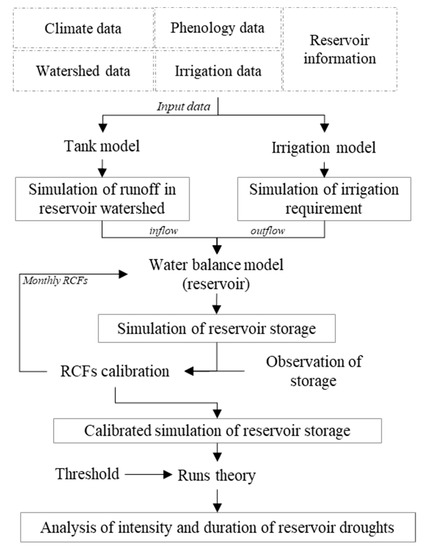 The key points of this study are to apply RCF calibration to the simulation of a reservoir in ungauged catchments and to assess the climate change impacts on reservoir droughts identified by intensity and duration of water requirement for recovery. Figure 1 shows a flowchart of this methodology. First, we applied the various data of climate, crop, and reservoir to the runoff and irrigation simulation models. Second, the results of models were adapted to the water balance model for simulating reservoir storages. After that, we applied the monthly RCFs to calibrate the simulation and validated the RCFs’ applicability through the observed data of reservoir storages from 2008 to 2017. Finally, we identified the reservoir droughts using the concept of “water requirement for recovery” and analyzed the intensity and duration of reservoir droughts in future seasons under a climate change scenario using Run theory.
