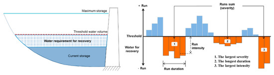 The resilience of agricultural reservoirs in this study is defined as recovery to the threshold storage level. In other words, the effect of climate change on reservoir operations was evaluated from the perspective of reservoir resilience via analysis of the speed at which reservoir water volume recovered, and this is similar to the analysis of recovery from natural disasters such as drought or floods. Therefore, we applied the water recovery concept to evaluate reservoir resilience to climate change, which the reservoir requires to recover to the stable level, as shown in Figure 2. First, we set the threshold water volume to identify the stable operation of the reservoirs. We applied a 10-year storage return period as the threshold value, which has been used widely for assessing the water supply capability of agricultural reservoirs in Korea [14]. Second, we estimated the water requirement for recovery, which indicates the gap between the threshold water volume and current storage. When the reservoir storage is significantly lower than the threshold volume, a large volume of water is required for the threshold to be reached, which is represented as the water required for recovery. In addition, if the reservoir storage is continuously below the threshold volume for a long time, its functioning as a water supplier could weaken. In other words, if it was deemed a reservoir drought and if this condition became severe and continued over a long term, we considered the resilience of the reservoir to worsen. Therefore, using Run theory, we considered the following as indicators of reservoir resilience and analyzed them: the duration, severity, and intensity of the water for recovery [53,54]. This theory is mostly used in drought characterization to analyze duration and intensity before recovery to a non-drought state [55,56]. Recently, the application of Run theory has been expanded with various drought analysis methodologies, such as the copula-based drought risk assessment and a nonlinear multivariate drought index [57,58]. In this study, the duration of water for recovery is expressed in days during which storage is continuously below the threshold value and the severity indicates a cumulative deficiency below the threshold water volume. Intensity is measured as the ratio of the severity to the duration, as shown in Figure 1.