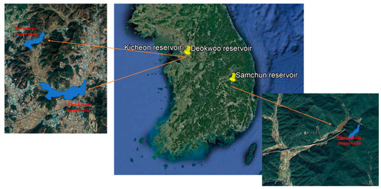 Reservoirs with various water storage capacities were investigated to reflect the diverse sizes and water storage capacities of reservoirs operated across Korea. The reservoirs selected for simulation in this study were agricultural reservoirs located in ungauged catchments (Figure 3) and the information of the selected reservoirs is shown in Table 1. Kicheon reservoir has a water storage capacity of 2,164,000 m3, which is the typical capacity of an agricultural reservoir in Korea. A larger reservoir (Deokwoo reservoir) and a smaller reservoir one tenth the size of the Kicheon reservoir (Samchun reservoir) were also included in the simulations to investigate the calibration efficiency for reservoir water volume using RCFs over a wide range of reservoir sizes. Particularly for the Samchun reservoir, the water storage volume increased from 96,000 m3 to 210,000 m3 owing to a reservoir enlargement project, and the accuracy of calibration using RCFs was evaluated under changes in reservoir water volumes. The simulated reservoir water volume on the basis of the measured meteorological data available from 2008 to 2017 and the actual reservoir water volume measured over the same period were used to calibrate the simulated values for reservoir water volume.