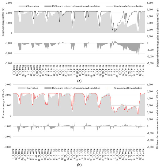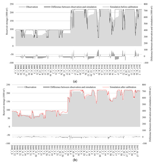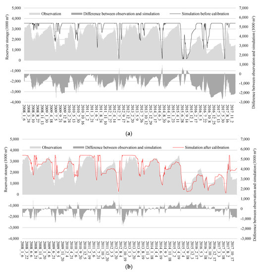 Simulation of water storage capacity of Deokwoo reservoir before and after calibration using RCFs. (a) Before calibration (Deokwoo reservoir); (b) after calibration (Deokwoo reservoir).