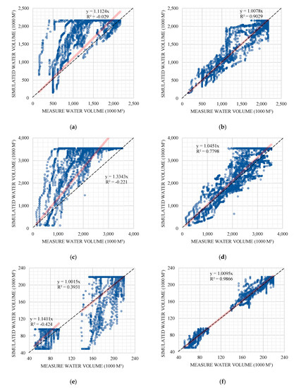 For the Kicheon reservoir, the simulated reservoir water volume without RCF calibration was higher than the measured water volume. This suggests that even when the actual water volume in the reservoir is insufficient, the simulation may indicate that there is enough water in the reservoir. Particularly in the period of 2015–2016, the measured reservoir water volume was primarily below 1000 m3, but simulations without calibration yielded reservoir water volumes of over 1000 m3 for these years. When the simulations were calibrated using RCFs, the simulated volumes differed from the measured volumes for certain time periods, but the simulation accuracy increased when compared to the accuracy of the uncalibrated simulations (Figure 7). Without calibration, the correlation between the simulated and measured reservoir water volumes was very low; however, the correlation increased after calibration of the simulated water volumes, and a linear relationship between simulated and measured volumes was observed with a correlation coefficient (R2) value of 0.9, indicating that the simulated reservoir values after calibration closely matched the measured values. Calibration using RCF was further conducted in simulations of water volumes in reservoirs of different sizes to test the applicability of the method.