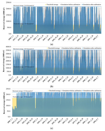 Simulation of reservoir water storage in Kicheon, Deokwoo, and Samchun reservoirs from 2008 to 2099 before and after calibration. (a) Kicheon reservoir; (b) Deokwoo reservoir; (c) Samchun reservoir.