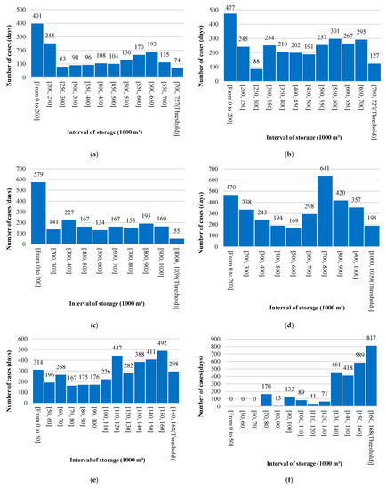 The quantitative analysis of changes in the climate change impact of reservoir water volume simulations before and after RCF calibration was achieved via analysis of the frequency at which reservoir water volume decreases below its threshold level (set as the water volume during a drought with a 10-year return period from 2008 to 2017). The histogram in Figure 9 shows the frequency at which the water volume decreased below the threshold level. The X-axis indicates the interval of storage, and the Y-axis indicates the number of days when the daily water volume is below the threshold level during 2008–2017.
