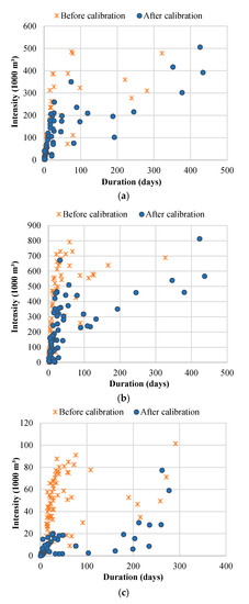 Similar results were found for the Deokwoo reservoir. The maximum intensity of reservoir drought increased from a required water volume of 792,000 m3 in the uncalibrated simulation to 813,000 m3 in the calibrated simulation, and the maximum drought duration increased from 327 to 437 days, respectively. Figure 10 also shows an increase in the consecutive occurrence of reservoir droughts that are predicted to continue for a long period of time.
