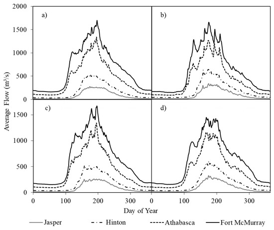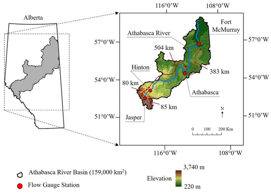 The Athabasca River Basin (ARB) has been subject to several hydrological studies over the past decade because of the increasing population and industrial/agricultural activities that this region has been experiencing over the past 40 years. There is particular interest in understanding the variability in the Athabasca River flow, because it represents an important resource for oil and gas extraction and operational processes, as well as agricultural irrigation. Changes in the magnitude of river flow and seasonality may lead to decreases in water supply, which will impact natural ecosystems, including freshwater species and streamside ecosystems that contribute to the rich floodplain forests [2,3,4]. These changes may also force alterations to water management regulations for multi-objective reservoirs [5,6,7]. Therefore, it is important to understand the temporal and spatial variability of current and future hydrologic regimes to provide for sustainable water resource management and monitoring programs.