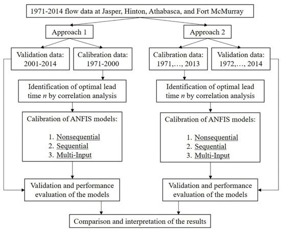 Generally, the ANFIS is superior to other modeling techniques reported in the literature to predict the Athabasca River flow at Fort McMurray. All the three methods used in this study, namely the “Nonsequential Athabasca–Fort McMurray”, “Sequential”, and “Multi-Input” ANFISs, performed better than other modeling techniques previously explored by other authors on the ARB, using both Approach 1 and 2. This indicates that the ANFIS is highly capable of capturing the nonlinearity of the natural river cycles over the year in cold weather regions, while bypassing the physical explanation of the input–output variables’ dependence. Not only can the ANFIS predict more accurately, it also uses a simpler set of input–output variables compared to the more complex dataset used by the VIC or SWAT, which employ a large amount of data for climate and runoff information to calibrate the model. Previous studies carried out in the ARB, which were discussed in the introduction section, show a lower performance in terms of Nash–Sutcliffe coefficient, compared to the method proposed in this paper. By using SWAT, Shresta et al. [14] achieved the highest accuracy level among past attempts found in the literature for the ARB, despite their highly data-demanding set of explanatory variables. Eum et al. [1] also showed a highly valuable modeling performance using a combination of VIC and GCM, although this approach could lead to longer computational times and more expensive budgets. The method proposed in this study shows that it is possible to achieve a higher accuracy when a limited number of inputs are employed, and a more simplistic input–output relationship is outlined. Interestingly, the use of the two calibration–validation dataset pairs (Approach 1 and 2) led to a difference in performance using the ANFIS for the three methods adopted in this study. This was also indicated by Zheng et al. [40], who investigated the statistical behavior of data splitting methods to achieve representative evaluation performance for flow forecasting [40,41,42]. Other modeling techniques should be investigated in a similar fashion to better understand the contribution of calibration–validation datasets on the accuracy of the model output. Finally, Approach 2 provided more accurate results for the three ANFIS methods, possibly because the model’s outcome is not influenced by time-dependent variables. For example, the variation in rainfall and snowmelt contributions, earlier springtime increases or late summer decreases, and the growing water uptake from the oil and gas industry from more recent years should be investigated and correlated to the river flow variations overtime.