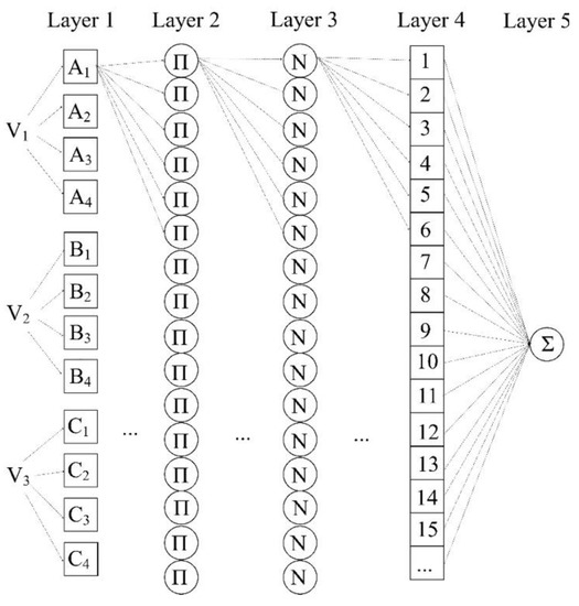 Layer 2: Every node is fixed (non-adaptive), and the circle node is labeled as Π. The output node results from the multiplication of incoming signals and is delivered to the next node. The T-norm operator with general performance (AND) is applied to obtain the output, because all the explanatory variables occur simultaneously.