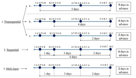 Between Jasper and Fort McMurray, r2 shows a poor correlation, where the highest coefficient of determination is observed at 5 days. Similar results indicate that between Hinton and Fort McMurray, the optimal lead time is 4 days. A strong correlation was found between Athabasca and Fort McMurray, where the highest r2 was 0.92 with two-day lead time. A similar correlation analysis was carried out between Jasper and Hinton and Hinton and Athabasca to estimate the optimal lead time between each station along the river. The optimal lead time between Jasper and Hinton is 1 day (r2 = 0.96), while that between Hinton and Athabasca is 3 days (r2 = 0.63). Figure 5 schematically summarizes the main findings in terms of how far in advance each developed model can predict flow at Fort McMurray. It should be noted that between Jasper and Fort McMurray, the best correlation was found at 5 days, while when summing the optimal lead time between each station (i.e., Jasper–Hinton = 1 day, Hinton–Athabasca = 3 days, and Athabasca–Fort McMurray = 2 days) the total optimal lead time is 6 days. This might be due to the actual optimal lead time between Jasper and Fort McMurray being in between 5 and 6 days (for Jasper-Fort McMurray, r2 = 0.504 at t-5 and r2 = 0.502 at t-6).