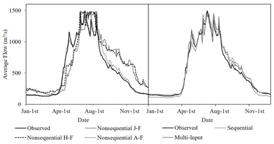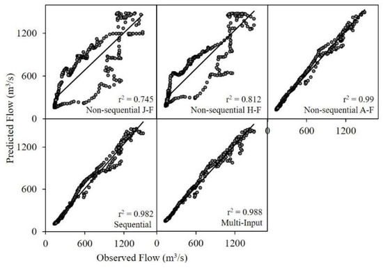 Figure 6 shows the hydrographs comparing the measured to the predicted flow at Fort McMurray using Approach 1. The scatter plots are shown in Figure 7. In general, the “Sequential” and “Multi-input” models perform more accurately during the springtime increase and late summer decrease than the “Nonsequential” models. The advantage of using the “Sequential” model is the higher predictive capability, as indicated in Figure 8. The “Nonsequential Athabasca–Fort McMurray” model is more accurate in predicting the base flow in the colder months, when there is no contribution of rainfall and snowmelt, while the “Multi-input” model could not perform as accurately. The scatter plots in Figure 7 show the low accuracy of the “Nonsequential” method using the Jasper and Hinton stations to predict river flow at Fort McMurray.