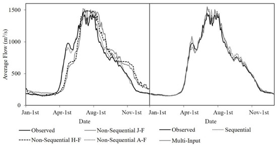 The performance of the developed models was compared and the results are summarized in Table 4. Overall, “Nonsequential Jasper–Fort McMurray” and “Nonsequential Hinton–Fort McMurray” can poorly predict river flow at Fort McMurray because, although their r2 values indicate a good correlation between the measured and predicted flow, the RMSE is considerably large in both approaches. A good performance is observed in the “Nonsequential Athabasca–Fort McMurray” model (ENS = 0.99 and RMSE = 49 m3/s for Approach 1 and ENS = 0.99, and RMSE = 46 m3/s for Approach 2), which can predict river flow at Fort McMurray over 2 days. Although this model is accurate, the limited predictive capability represents a disadvantage. The “Sequential” model helps to cope with this limitation, providing accurate predictions over 6 days (ENS = 0.98 and RMSE = 66 m3/s for Approach 1, and ENS = 0.99 and RMSE = 43 m3/s for Approach 2). Among the models proposed in this study, the most accurate is “Multi-input”, with ENS = 0.98 and RMSE = 39 m3/s using Approach 2. However, similarly to “Nonsequential Athabasca–Fort McMurray”, this model allows predictions over 2 days.