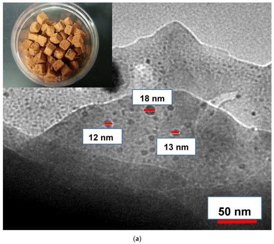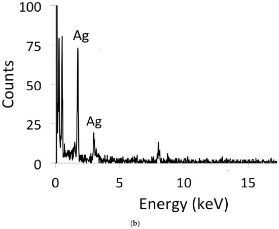 Roughly spherical silver nanopatches on the ceramics were seen using TEM. A TEM image of Ag clusters produced is shown in Figure 1a. Silver nanopatches were confirmed to be metallic silver by energy-dispersive spectroscopy (EDS) and are spherical in morphology; Figure 1a,b. The observed nanocluster size distribution was around 10 nm. The biggest size of Ag cluster was 18 nm. Similar nanopatches were also reported by Singh et al. [13]. We tried extensively to image copper nano patches, but we have been unsuccessful in doing so. We were probably not able to image copper because of the interference with the coating material. However, we were able to do the copper confirmatory test using GFAA.
