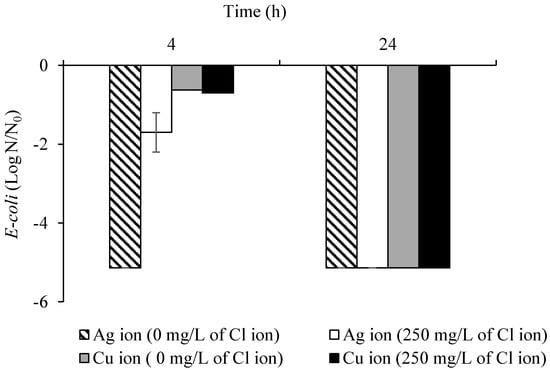 For silver and copper nitrate batch experiments, silver ion and copper ion concentrations were 50 µg/L (silver as silver nitrate) and 500 µg/L (copper as copper nitrate), respectively. Chloride ion concentrations were varied from 0 to 250 mg/L. E. coli disinfection ability was detected after 4 h and 24 h. Initial E. coli concentrations at both time points were 106 cfu.