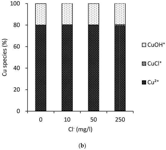 Accordingly, silver disinfection of microorganisms was decreased by concentrations of chloride ion exceeding 25 mg/L [7]. Bacterial disinfection by silver chloride complexes was three times less than that by silver ion alone at 2.8 μM concentration of silver [20]. This figure (Figure 3) shows that silver ions are the only species present in the absence of chloride ions. The silver ion component was changed to 61%, 22%, and 4% with chloride ion concentrations of 10 mg/L, 50 mg/L, and 250 mg/L, respectively. The formation of silver chloride and silver dichloride resulted in decreased disinfection ability. Copper ion concentration was not significantly changed at the same condition (79.1% to 80.0%). This indicates that copper-embedded ceramic cubes are a better option for disinfection than silver-embedded ceramic cubes at high concentrations of chloride ions. According to the MINTEQ equilibrium model analysis, the speciation of copper was not significantly changed with the increasing concentration of chloride ions.