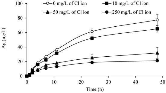 Trend of silver concentration (µg/L) in the presence of increasing chloride ion concentration with time in 200 mL DI water. Error bars represent standard error.