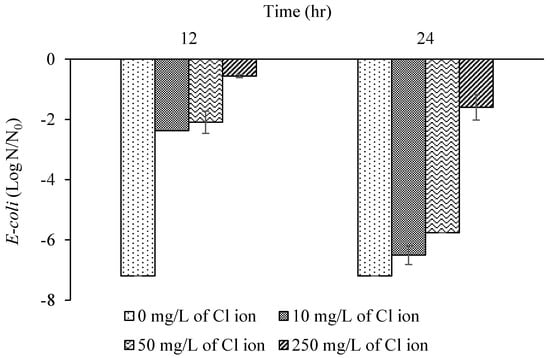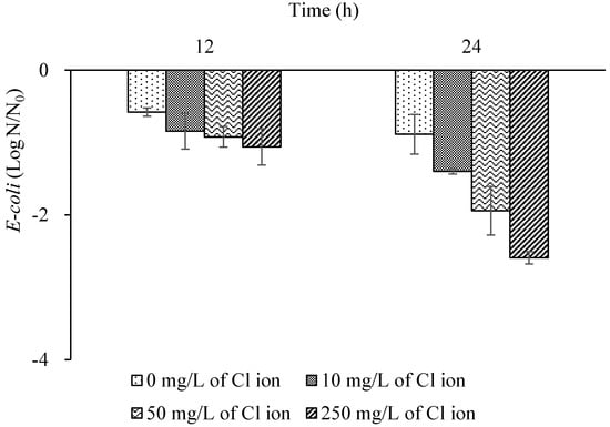 At the 12 h treatment, disinfection efficiency was increased with increasing concentration of chloride ions; log reduction of E. coli was 0.6, 0.8, 0.9, and 1.1 at a chloride concentration of 0, 10, 50, and 250 mg/L, respectively (Figure 7). Log reduction of E. coli increased to 0.9, 1.4, 1.9, and 2.6 at 24 h treatment. Disinfection efficiency of copper embedded cubes was increased by increasing concentration of chloride ions owing to the positive effect of chloride ions on the copper oxidation rate. Disinfection efficiency of copper-embedded cubes was lower than that of silver-embedded cubes. This is because of the slower copper oxidation rate and lower disinfection ability compared with silver ions.