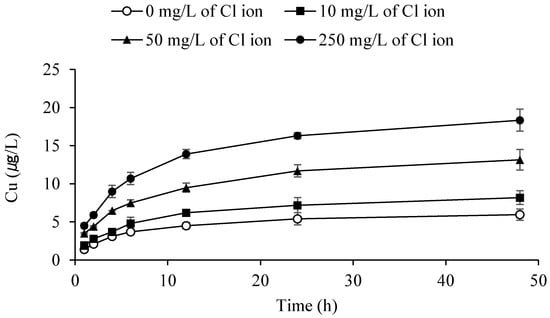 The concentration of released total copper was shown at different concentrations of chloride ion (Figure 6). Each sample had five copper embedded ceramic cubes (50 mg Cu per each cube) in 200 mL of phosphate buffer solution. This concentration of copper ions increased sharply for 6 h, but reached a steady state after an additional 6 h. The experiment was performed with ceramic cubes containing five times more copper than silver because of the slow oxidation of copper ions from the ceramics. Silver is approximately 10 times more effective in disinfection based on our lab experiments. Moreover, the World Health Organization (WHO) permissible limit for copper is 10 times higher than silver (0.1 mg/L for silver and 1 mg/L for copper). We planned these experiments after taking into account all these factors. However, the actual concentration of copper released was found to be less than the concentration of silver. Jackson et al. [9] also reported that release of copper was lower than that of silver. Moreover, these data show that the concentration of copper was increased by increasing chloride ions. It seems that there is a synergistic effect of chloride ion on copper oxidation. Copper oxidation can be affected by chloride ions at a low concentration of copper [24]. In addition, the oxidation mechanism of copper is strongly dependent on the presence of chloride ions [25,26].