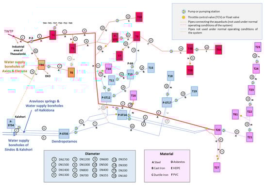 Figure 2 presents a basic layout of Thessaloniki’s aqueducts within the conurbation. Blue, red, purple, and orange colors represent water supplied by the aqueduct of Aravissos, Aliakmonas, Aravissos, and Aliakmonas, or Aliakmonas and water supply boreholes, respectively.