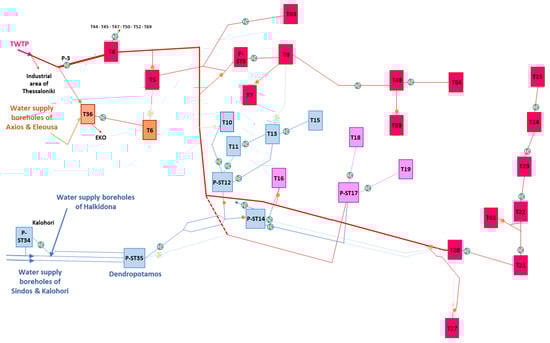 Figure 3). It should be noted that the city center of Thessaloniki is supplied directly from pressure pipe DN800 from P-ST35. The industrial area of Thessaloniki is supplied with almost 35,000 m
