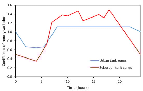 Figure 6) is used to estimate water demand in the tank zones of the system (both urban and suburban). This peak factor is only applied to tank zones with domestic consumers, while water demand in industrial areas of the system is kept constant. Considering the conservative case in which a failure at one of the city’s aqueducts happens when water in the system’s tanks is at its lowest level during normal operating conditions,