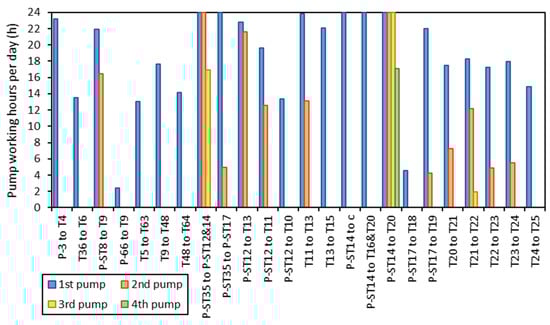 Figure 7 presents the daily operation time for all pumping stations or pumps of Thessaloniki’s aqueducts, estimated from the hydraulic simulation of the system during normal operating conditions. Pump operation was adjusted following the methodology described in