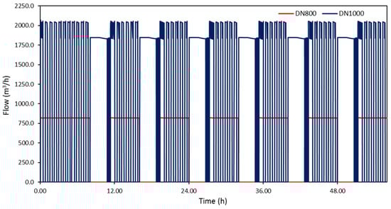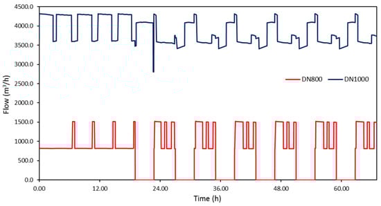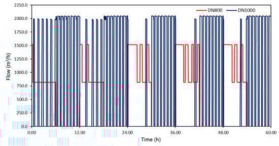 Figure 9 presents total flow at the two central pipes (DN800 and DN1000) of Aravissos aqueduct for the simulation period of 2.5 days. It can be noted that water supply of DN800 strictly follows the intermittent water supply schedule for Aravissos aqueduct (six-hourly water supply followed by six-hourly cut off). For the pumping group of DN800, one pump constantly operates at P-ST35 during water supply periods, while the second one turns on conditional on water elevation in P-ST17. Water supply of pipe DN1000 is continuously interrupted, due to adjustments performed in the hydraulic model (turning a pump on or off depending on water level in P-ST35).
