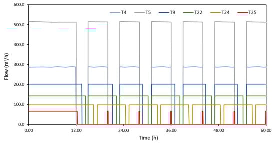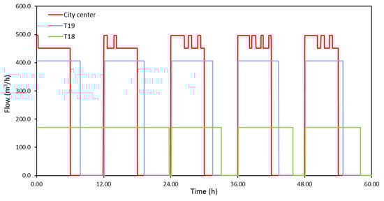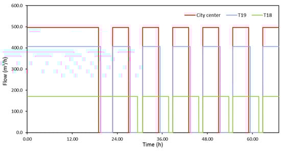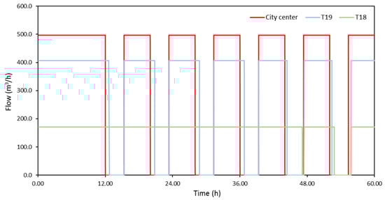 Figure 17 presents total flow at the city center, supplied directly from Aliakmonas aqueduct through DN500, as well as water supply of tank zones T18 and T19 during the 2.5 days (two days plus 12 h to use storage volume of tanks) simulation period. Water supply of the city center strictly follows the applied intermittent water supply schedule, tank zone T19 is supplied for somehow longer periods than those defined, while water supply of tank zone T18 covers the most of the simulation period. The water supply of tank zone T11 lasts longer than assigned, tank zone T10 follows the intermittent water supply schedule with very short interruptions therein, tank zone T13 strictly follows the intermittent water supply schedule, while the performance of the high-altitude tank zone T15 is improved (compared to emergency scenario 1). Some tank zones in Aliakmonas aqueduct perform quite similar to emergency scenario 3, while some differences arise for tank zones T5, T6, T7, T9, T10, and T64.