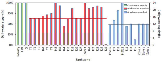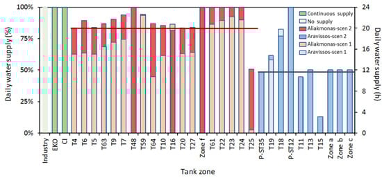 Figure 12 presents daily water supply (in hours and in %) for all tank zones of the system during a typical day (application of the intermittent water supply schedule has already started) for emergency scenario 1. Specified duration of water supply periods based on the applied intermittent water supply schedule for both aqueducts is also included as a straight line (blue and red color for the aqueducts of Aravissos and Aliakmonas, respectively). The green bars correspond to areas of the system, where water supply is considered uninterrupted (the industrial area of Thessaloniki, EKO industry, and critical infrastructure of the city).