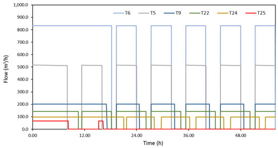 Figure 11 presents water supply in some indicative tank zones of Aliakmonas aqueduct (T4, T5, T9, T22, T24, T25). For tank zones T4, T5 and T6 (not shown here), the objectives of the intermittent water supply schedule for Aliakmonas aqueduct are quite fully accomplished. However, in the majority of the aqueduct’s tanks, it is rather difficult to strictly follow the designed schedule, mainly due to network topology issues and the relative comparison between the storage volume of each tank and water consumption/demand in its tank zone. For the series tanks T22, T61, T23, T24 in the eastern part of Thessaloniki city, it is quite evident that water supply periods are longer than the ones assigned in the schedule, mainly caused by pumping schedules applied in this scenario. However, the water supply of the high-altitude tank T25 seems to be highly problematic.