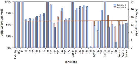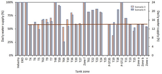 Figure 16 presents daily water supply (in hours as well as %) for all tank zones of the system during a typical day (application of the intermittent water supply schedule has already started) for emergency scenario 3. Specified duration of water supply periods based on the applied intermittent water supply schedule for emergency scenario 3 is also included as a straight line. The industrial area of Thessaloniki, EKO industry, and critical infrastructure in the northeastern part of the city are considered to receive continuous water supply during the crisis.